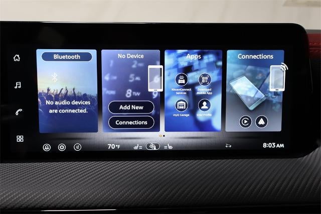 - Radio: AM/FM/SiriusXM Audio System -inc: 12.3" color touchscreen display w/6 speakers, Bluetooth® hands-free phone system, streaming audio via Bluetooth®, NissanConnect Services powered by SiriusXM featuring wireless Apple CarPlay, wireless Android Auto, Siri eyes free and hands-free text messaging assistant, audio and Bluetooth® steering wheel switches and Wi-Fi hotspot