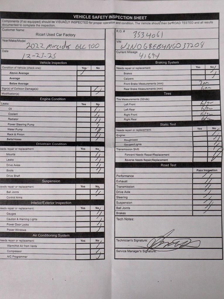 This 2022 Mercedes-Benz GLC 300 4MATIC® delivers refined luxury with confident all-wheel-drive performance in a sleek, modern SUV design. Powered by a turbocharged engine paired with a smooth 9-speed automatic transmission, it offers composed acceleration and balanced handling for daily driving and longer trips alike. The interior is finished in Silk Beige MB-Tex and features a premium, tech-forward cabin with the MBUX multimedia system, integrated navigation with live traffic, panorama roof, and thoughtful comfort amenities throughout. Finished in Lunar Blue Metallic, this GLC 300 blends sophistication and versatility—available now at Ricart Automotive Used Car Factory.