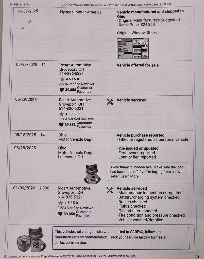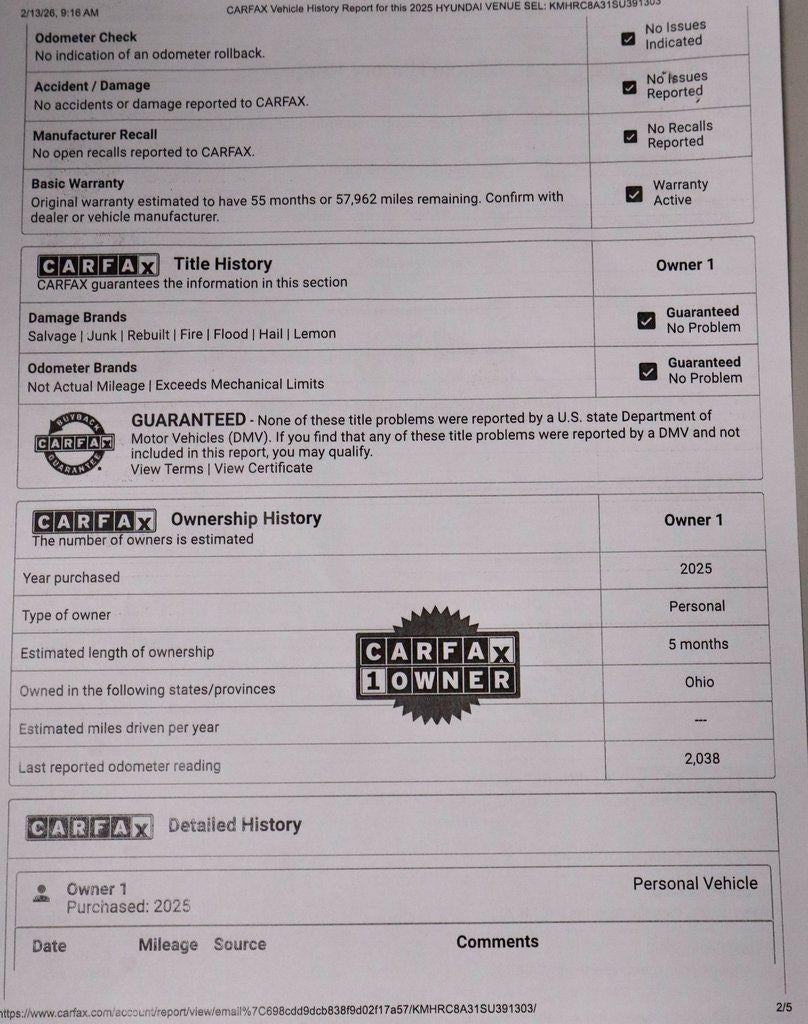 This 2025 Hyundai Venue SEL delivers a smart, urban-friendly SUV experience with bold styling and efficient everyday performance. Designed for easy maneuverability and confident daily driving, it offers a comfortable ride well suited for commuting and city adventures. The interior is finished in Black cloth seating and provides a thoughtfully laid-out cabin with intuitive controls and practical comfort for both driver and passengers. Equipped with a power moonroof and Hyundai’s advanced safety technology, this Venue SEL is available now at Ricart Automotive Used Car Factory.